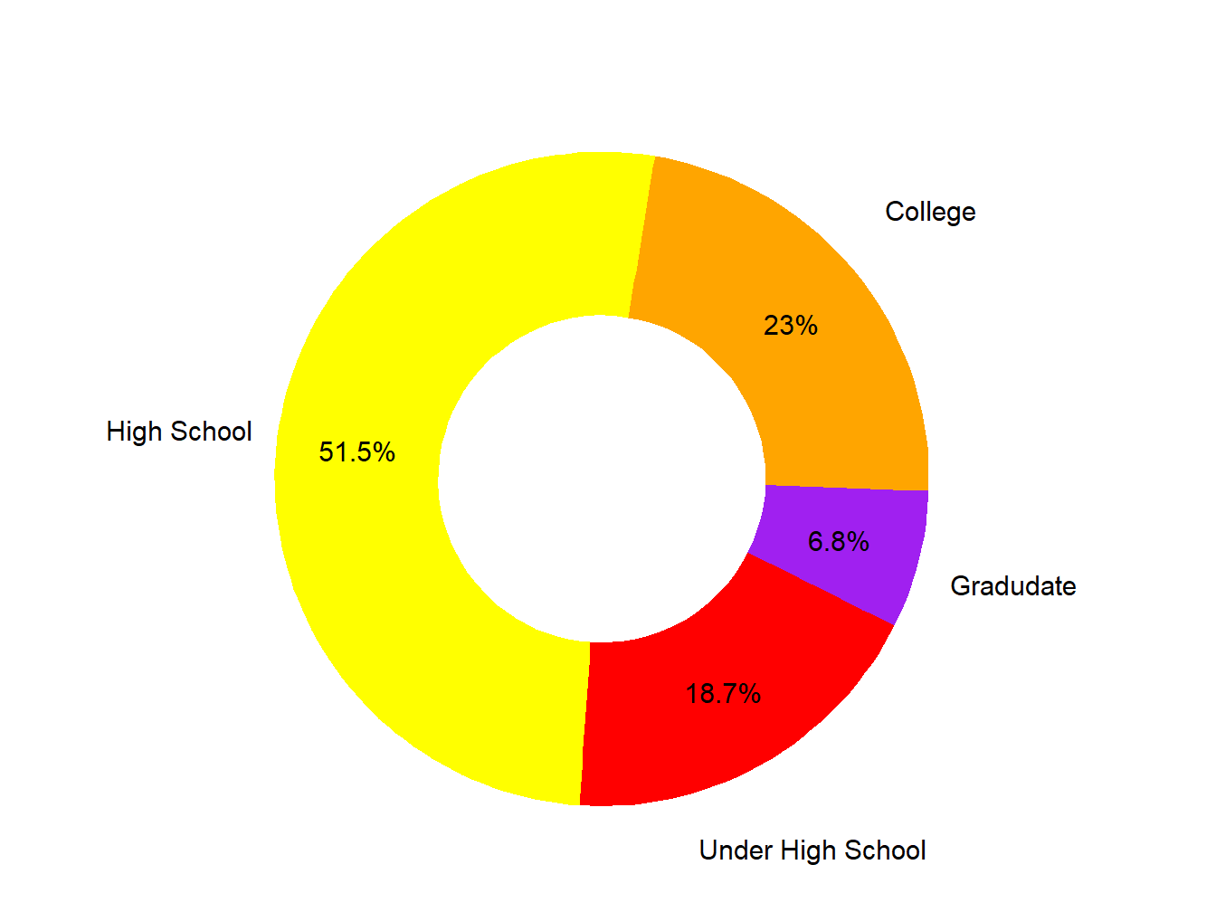 This ranking considers the 18.7% of those over 25 years old with an Under High School level of educational attainment compared with 23% and 6.8% that have attained a college and graduate level of education, respectively.