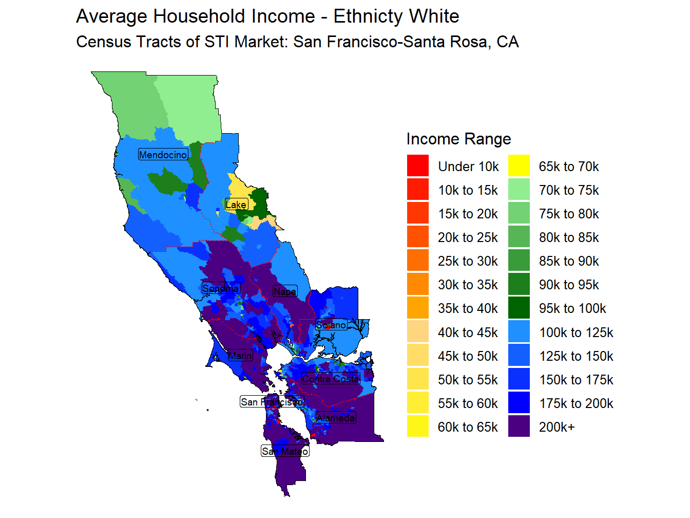With an Average Household Income for those head of householders Non-Hispanic White of $208,428 the San Francisco-Santa Rosa, CA market ranks 2nd across STI Markets.
