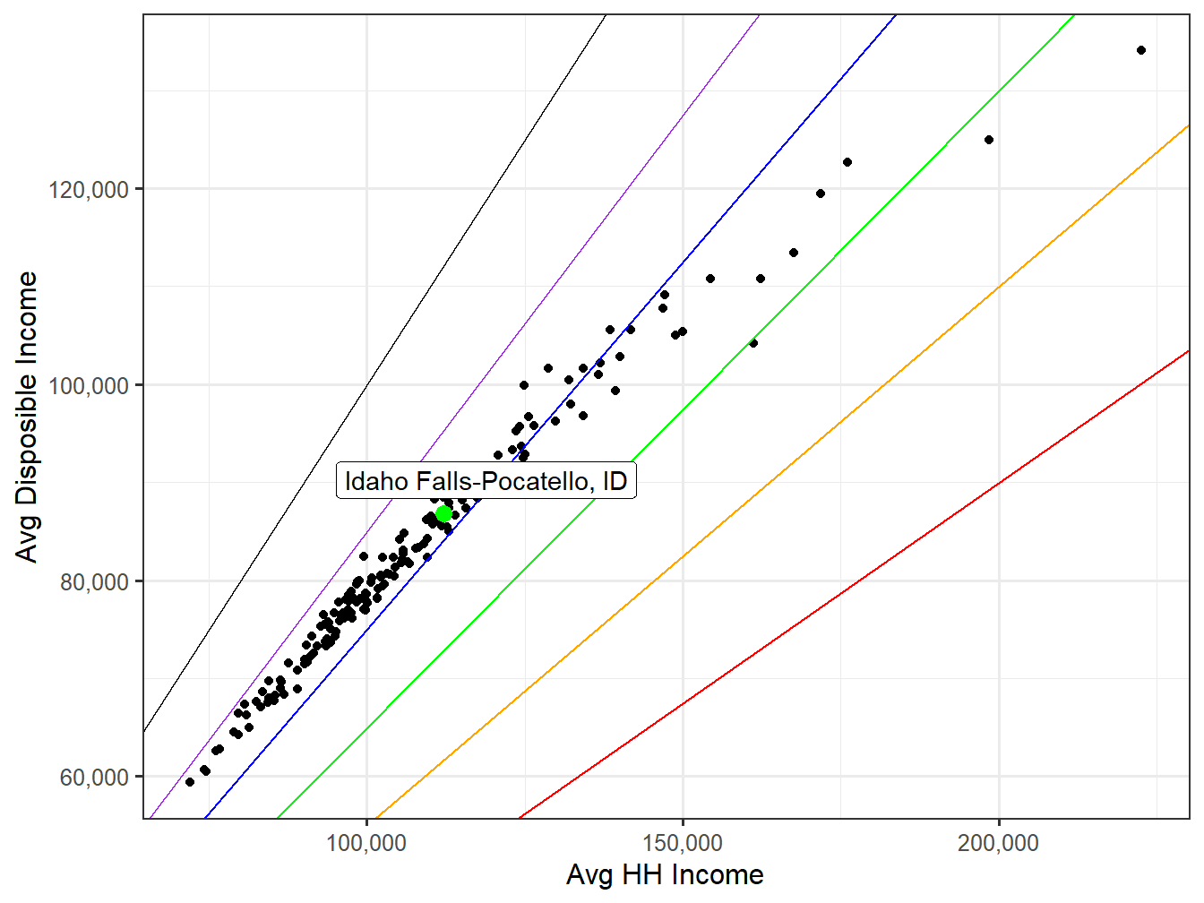 Below the multi-colored line represents the same data for household income in the Idaho Falls-Pocatello, ID market, but more equally lays out the distribution of population versus the income level, correcting for differences in size of income ranges. You will also notice that after 200k the income ranges are scaled down so the focus is more centered on the more numerous Households making under 200k. The black line represents the National Income Distribution for comparison.