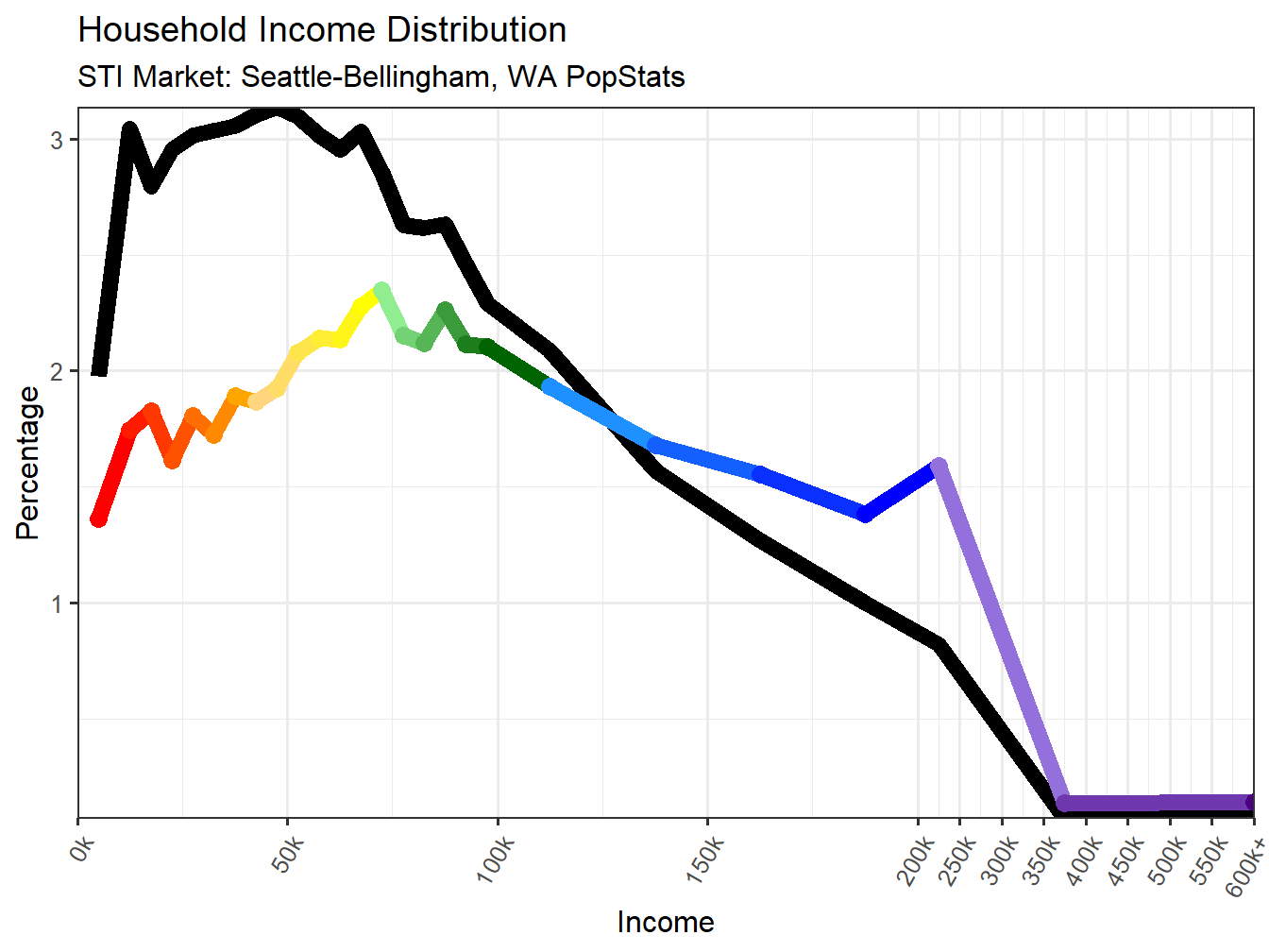 Below the multi-colored line represents the same data for household income in the Seattle-Bellingham, WA market, but more equally lays out the distribution of population versus the income level, correcting for differences in size of income ranges. You will also notice that after 200k the income ranges are scaled down so the focus is more centered on the more numerous Households making under 200k. The black line represents the National Income Distribution for comparison.