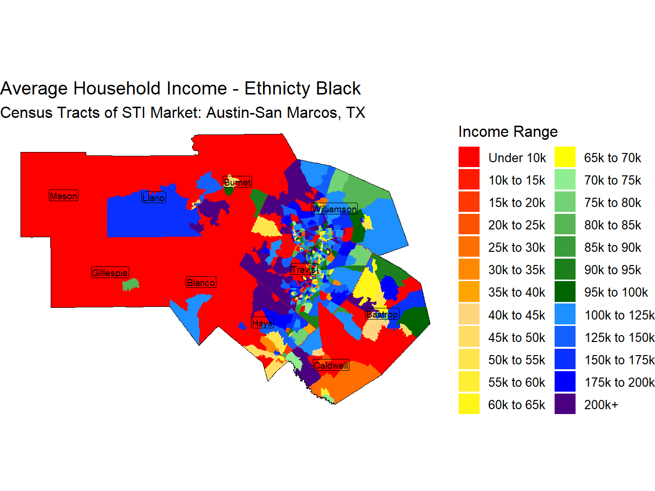 With an Average Household Income for those head of householders identifying as Non-Hispanic Black of $121,935 the Austin-San Marcos, TX market ranks 10th across STI Markets.