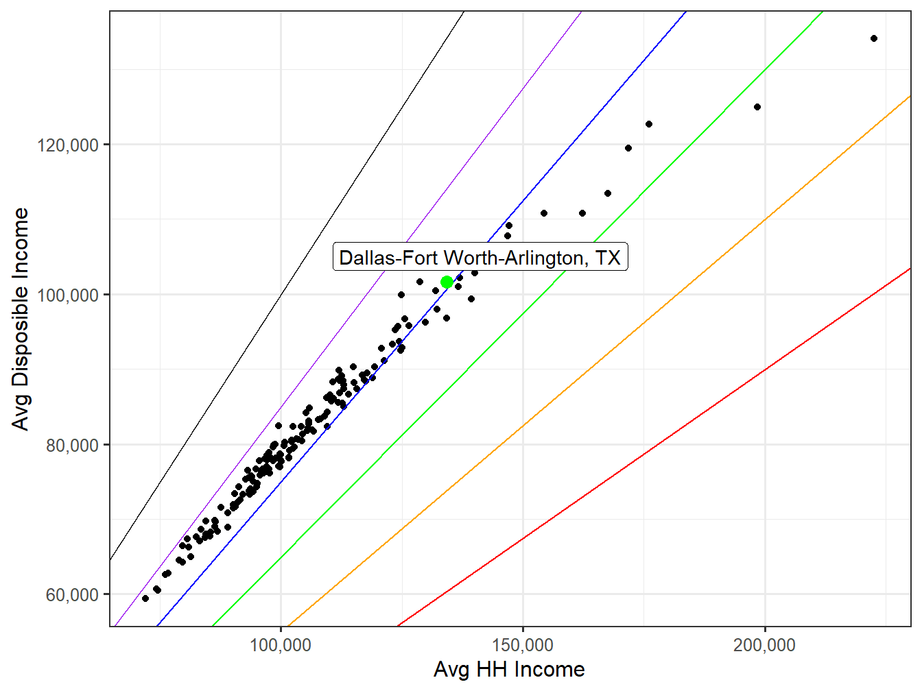 Disposable income is defined here as Household Income after accounting for Federal, State, and Local taxes. The Average Household Disposable Income is $101,597 which ranks 17th across STI Markets.