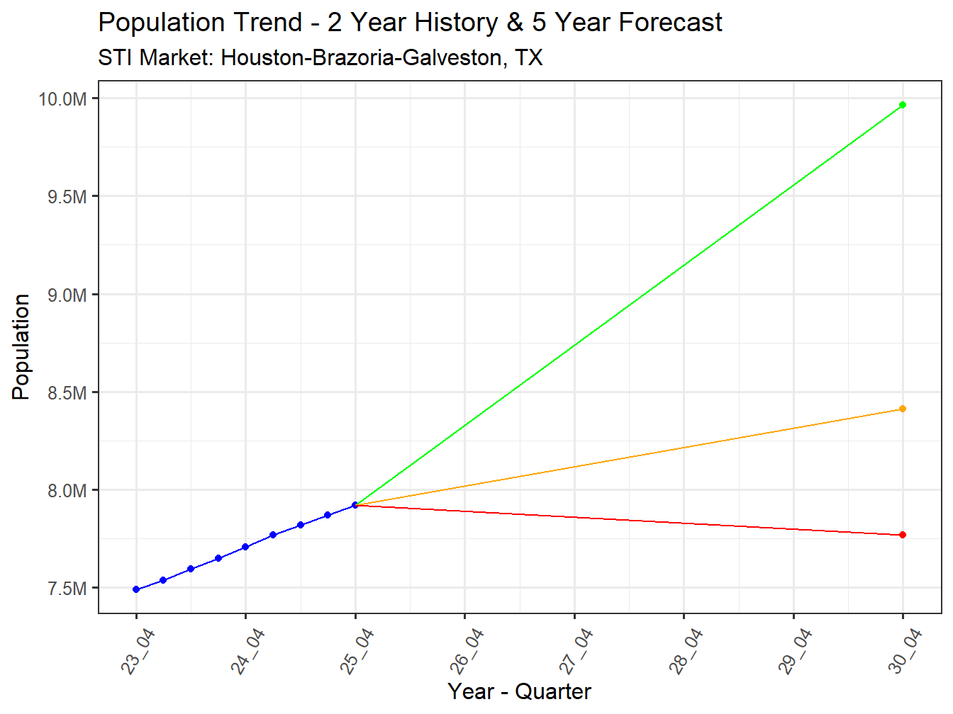 The current population of the Houston-Brazoria-Galveston, TX Market is 7,920,518 as of the April 2025 PopStats estimate. PopStat’s Trend models indicate a 5 year population change of 6.2%, resulting in a Population of 8,410,462 by April 2030. This percentage change in Population ranks 19th across STI Markets. The Houston-Brazoria-Galveston, TX Market currently ranks 7th in overall population, and will rank 6th by April 2030.