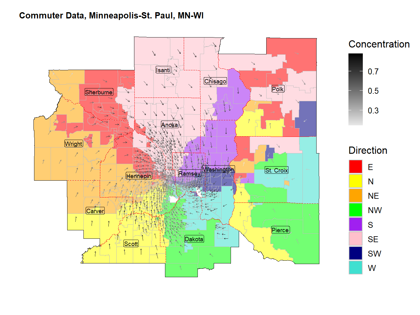 The following shows the commute to work patterns for the Minneapolis-St. Paul, MN-WI Market. The average direction is found via a circular mean function. The concentration is the proportion of overall travel headed in that direction and those adjacent to that direction. Length of arrow is scaled by the distance traveled. Together this allows for a general view of how traffic flows around the market each morning.
