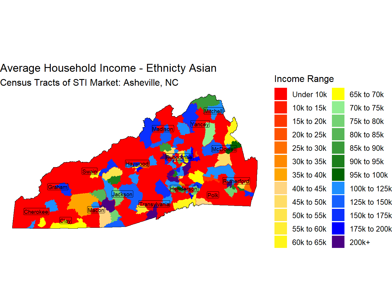 With an Average Household Income for those head of householders identifying as Non-Hispanic Asian of $113,351 the Asheville, NC market ranks 97th across STI Markets.