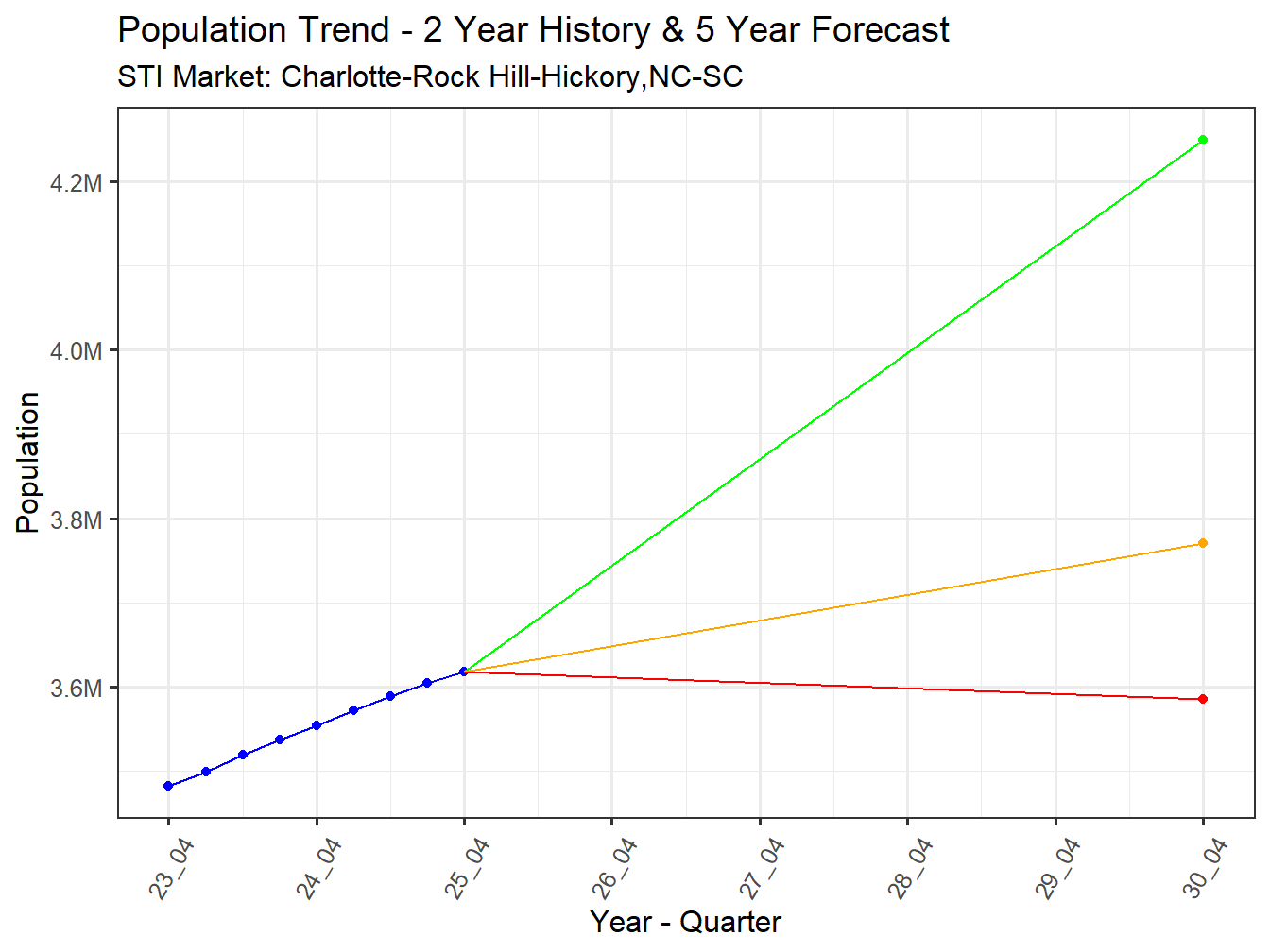 The current population of the Charlotte-Rock Hill-Hickory,NC-SC Market is 3,617,634 as of the April 2025 PopStats estimate. PopStat’s Trend models indicate a 5 year population change of 4.2%, resulting in a Population of 3,770,065 by April 2030. This percentage change in Population ranks 41st across STI Markets. The Charlotte-Rock Hill-Hickory,NC-SC Market currently ranks 23rd in overall population, and will rank 24th by April 2030.