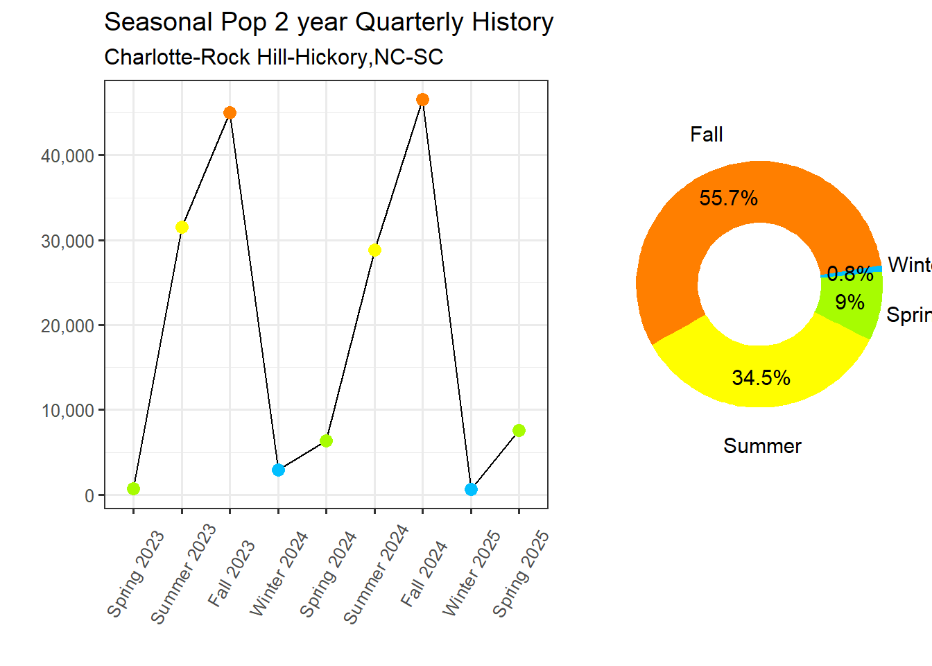 Seasonal visitation peaks in the Fall with a Seasonal Population of 46,592. The off season is the Winter with a Seasonal Population of 675. Given the difference between the primary and off seasons the Charlotte-Rock Hill-Hickory,NC-SC Market is classified as having a Extreme level of seasonal variation, ranking 2nd across STI Markets.