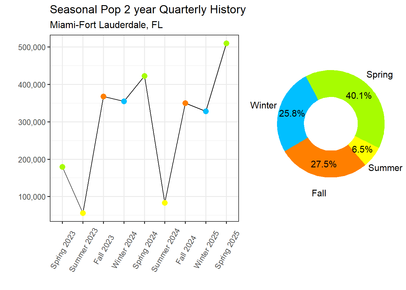 Seasonal visitation peaks in the Spring with a Seasonal Population of 510,064. The off season is the Summer with a Seasonal Population of 83,034. Given the difference between the primary and off seasons the Miami-Fort Lauderdale, FL Market is classified as having a High level of seasonal variation, ranking 98th across STI Markets.