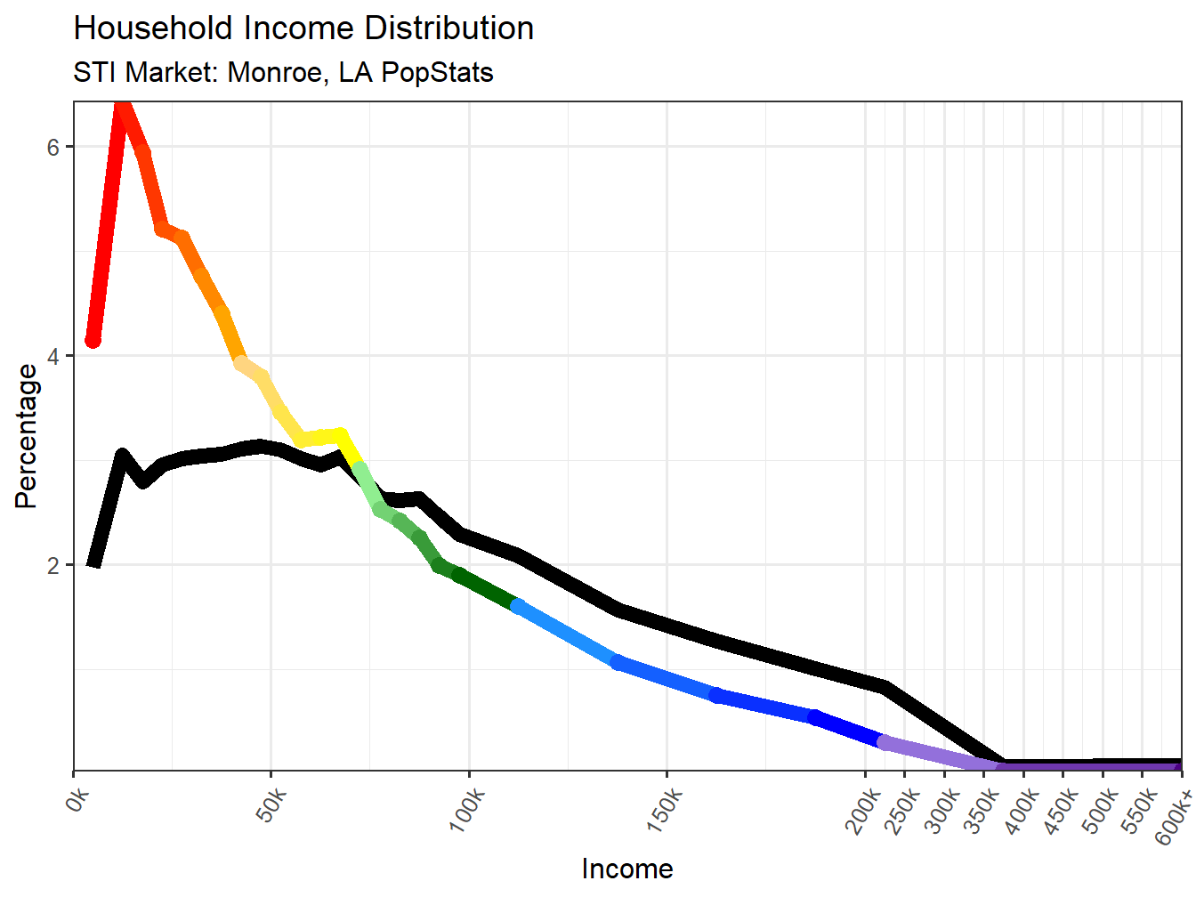 Below the multi-colored line represents the same data for household income in the Monroe, LA market, but more equally lays out the distribution of population versus the income level, correcting for differences in size of income ranges. You will also notice that after 200k the income ranges are scaled down so the focus is more centered on the more numerous Households making under 200k. The black line represents the National Income Distribution for comparison.