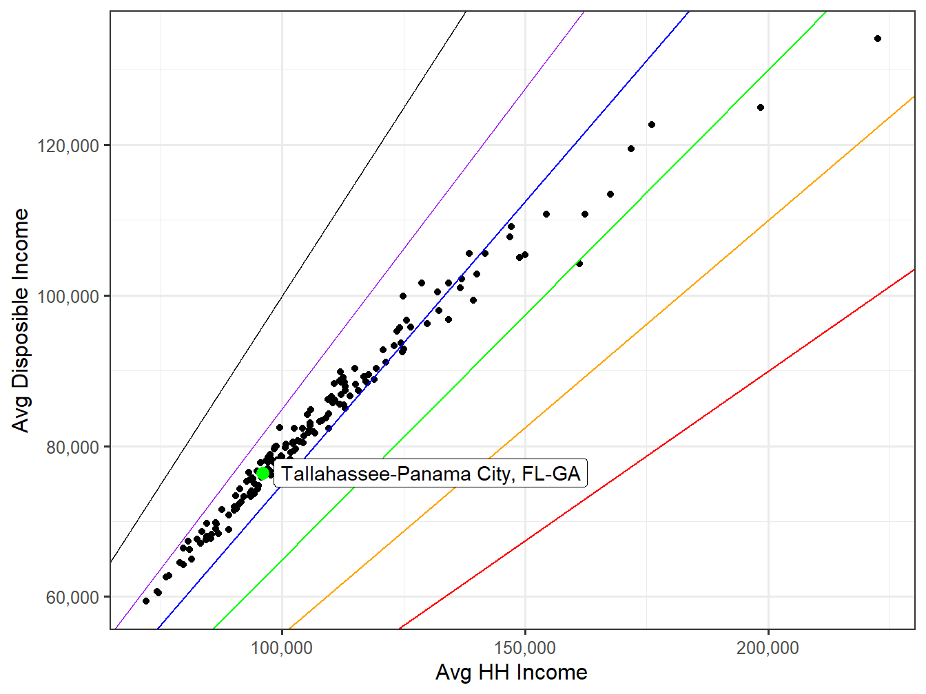Disposable income is defined here as Household Income after accounting for Federal, State, and Local taxes. The Average Household Disposable Income is $76,387 which ranks 117th across STI Markets.