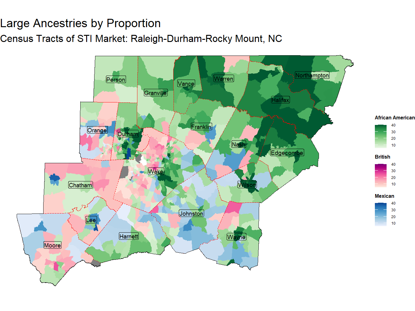 Large ancestries in the Raleigh-Durham-Rocky Mount, NC Market include African American, British, and Mexican . These ancestries make up 15.7%, 6.6%, and 6.3% of the total population, respectively. When comparing to national proportions, the African American ancestry is the most notable with a location quotient of 2.09 the proportion of this ancestry ranks 22nd across STI Markets.