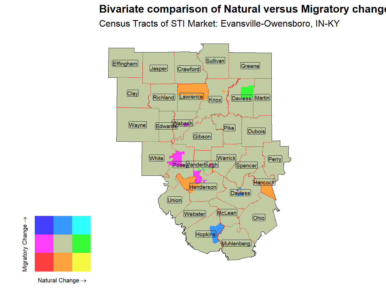 With a 2 Year Compound Annual Growth Rate (CAGR) of -0.04% the Evansville-Owensboro, IN-KY Market is declining. It ranks 132nd in 2 year population change across all STI Markets.
