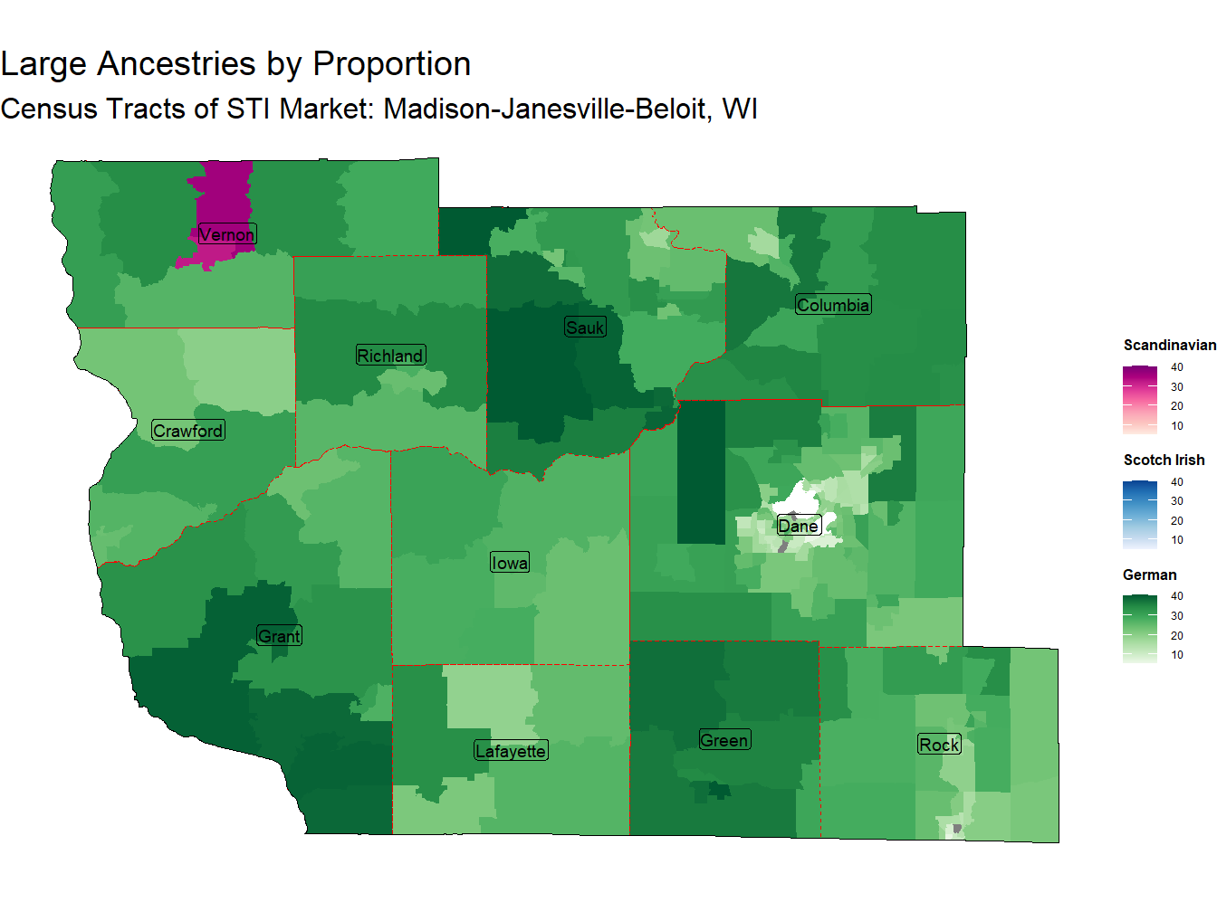 The Madison-Janesville-Beloit, WI Market is also home to a larger than average share of people with Dutch, Polish, and French Ancestries. These ancestries account for 0.9%, 2.3%, and 1.3% of the population, respectively. With location quotient of 1.8, 1.64, and 1.18 the Dutch, Polish, and French Ancestries rank 22nd, 23rd, and 34th across STI Markets, respectively.