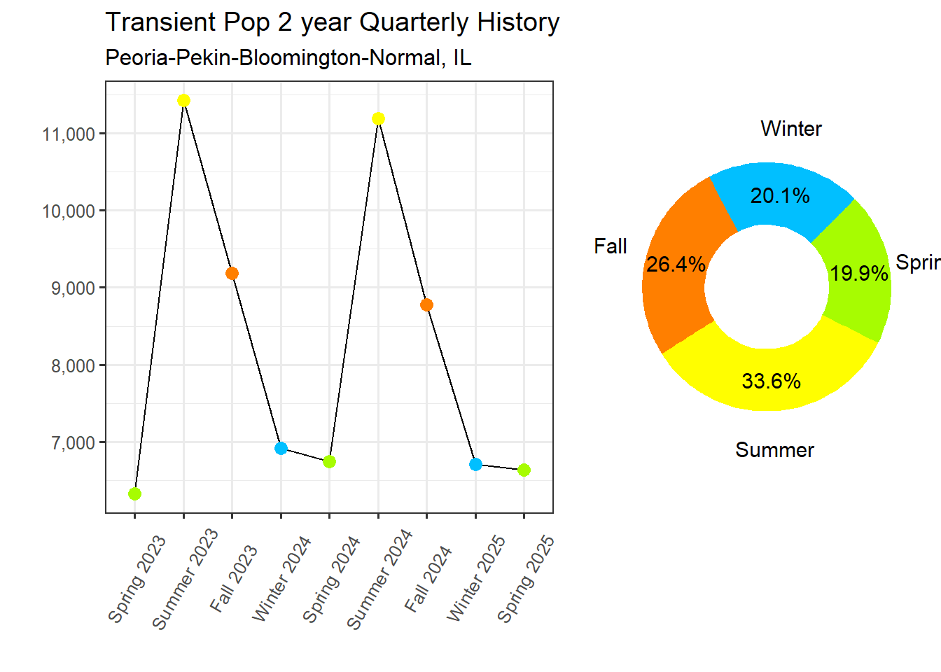 Transient visitation peaks in the Summer with a Transient Population of 11,187. The off season for transient visitation is the Spring with an avg over night stay count of 6,635. Given the difference between the primary and off seasons the Peoria-Pekin-Bloomington-Normal, IL Market is classified as having a High level of transient seasonal variation, ranking 90th across STI Markets.