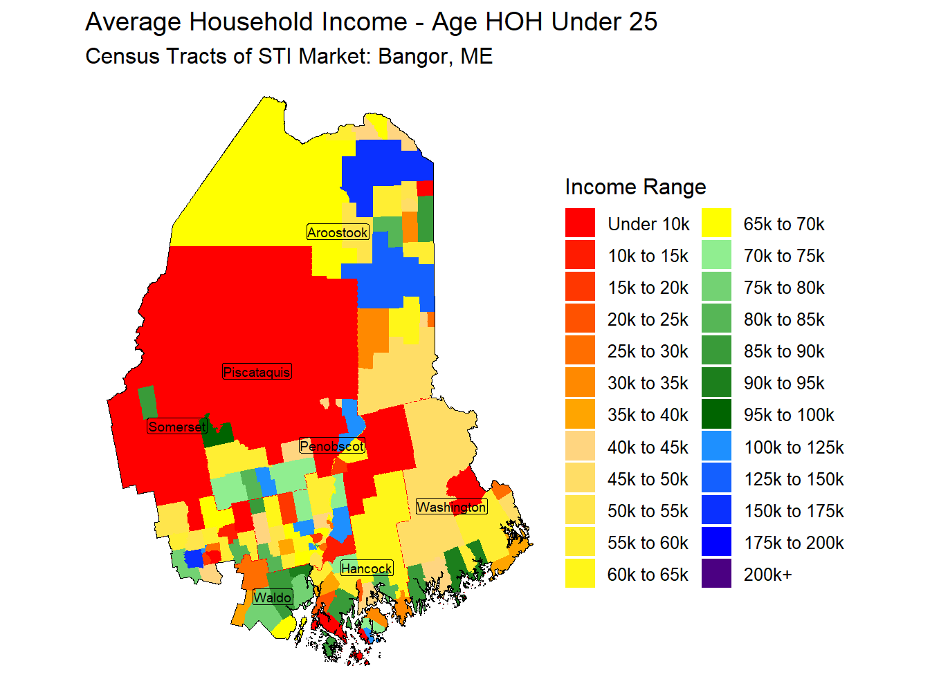 With an Average Household Income for those head of householders aged under 25 of $59,679 the Bangor, ME market ranks 99th across STI Markets.