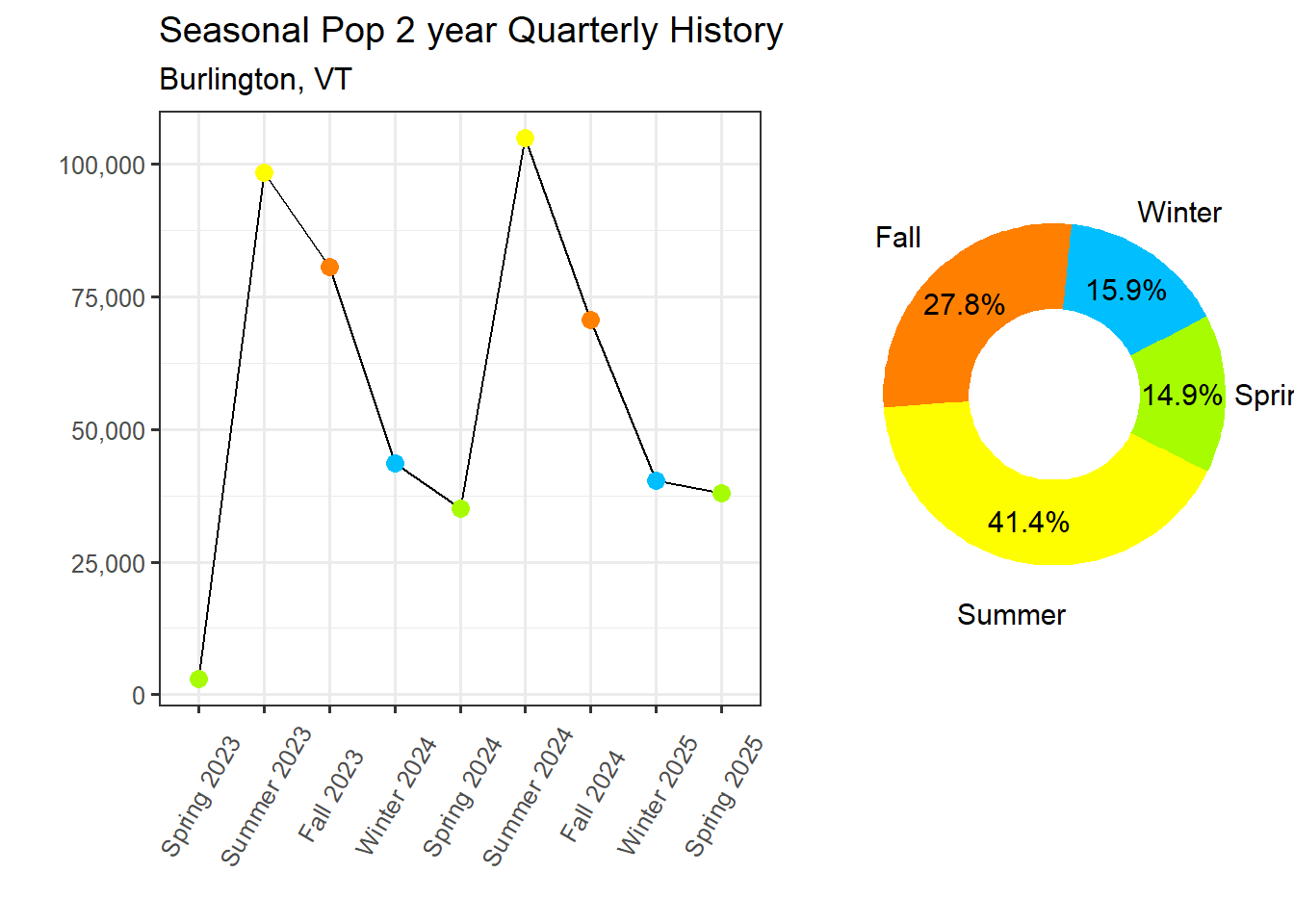 Seasonal visitation peaks in the Summer with a Seasonal Population of 104,901. The off season is the Spring with a Seasonal Population of 37,909. Given the difference between the primary and off seasons the Burlington, VT Market is classified as having a Medium level of seasonal variation, ranking 150th across STI Markets.