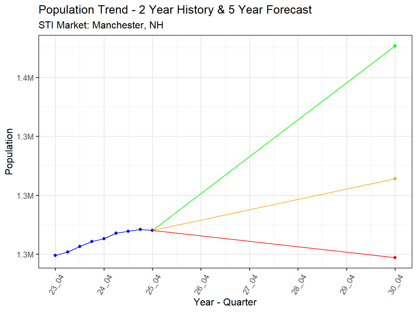 The current population of the Manchester, NH Market is 1,285,157 as of the April 2025 PopStats estimate. PopStat’s Trend models indicate a 5 year population change of 1.7%, resulting in a Population of 1,307,064 by April 2030. This percentage change in Population ranks 109th across STI Markets. The Manchester, NH Market currently ranks 83rd in overall population, and will rank 84th by April 2030.