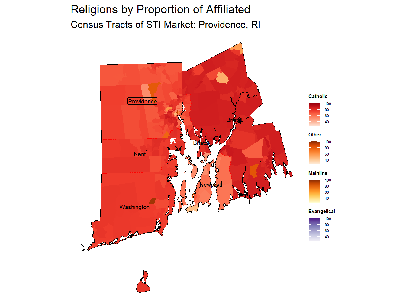 The 3 largest main religions in the Providence, RI Market are Catholic, Mainline, and Evangelical . These religions make up 80.2%, 10.8%, and 3.8% of the affiliated population, respectively. When comparing to national proportions, the Catholic religion is the most notable with a location quotient of 2.07 the proportion of this religion ranks 1st across STI Markets.