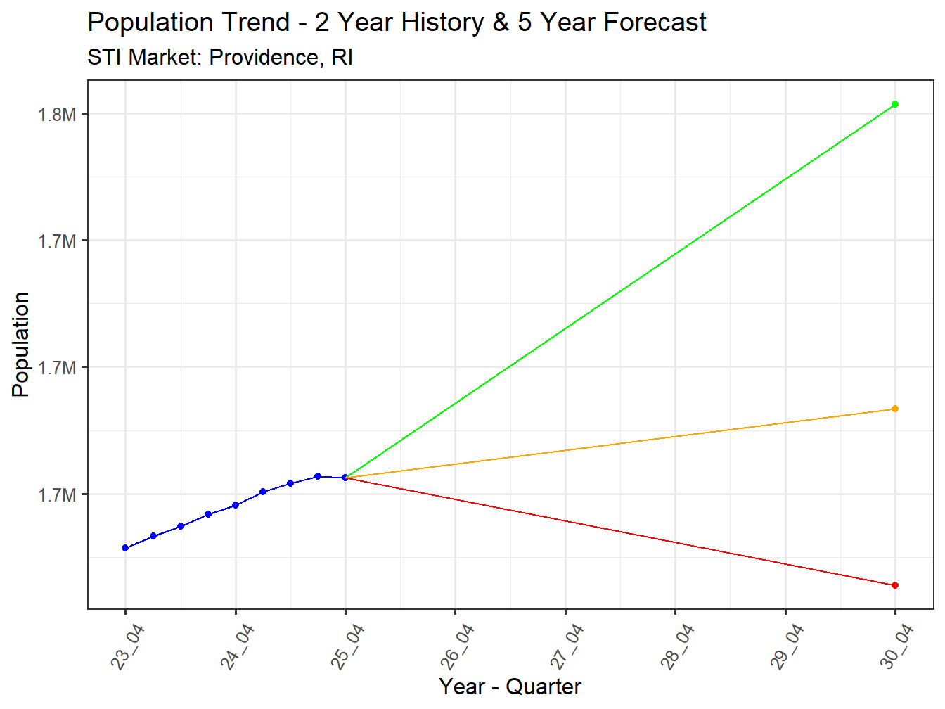 The current population of the Providence, RI Market is 1,702,571 as of the April 2025 PopStats estimate. PopStat’s Trend models indicate a 5 year population change of 0.6%, resulting in a Population of 1,713,404 by April 2030. This percentage change in Population ranks 133rd across STI Markets. The Providence, RI Market currently ranks 62nd in overall population, and will rank 60th by April 2030.