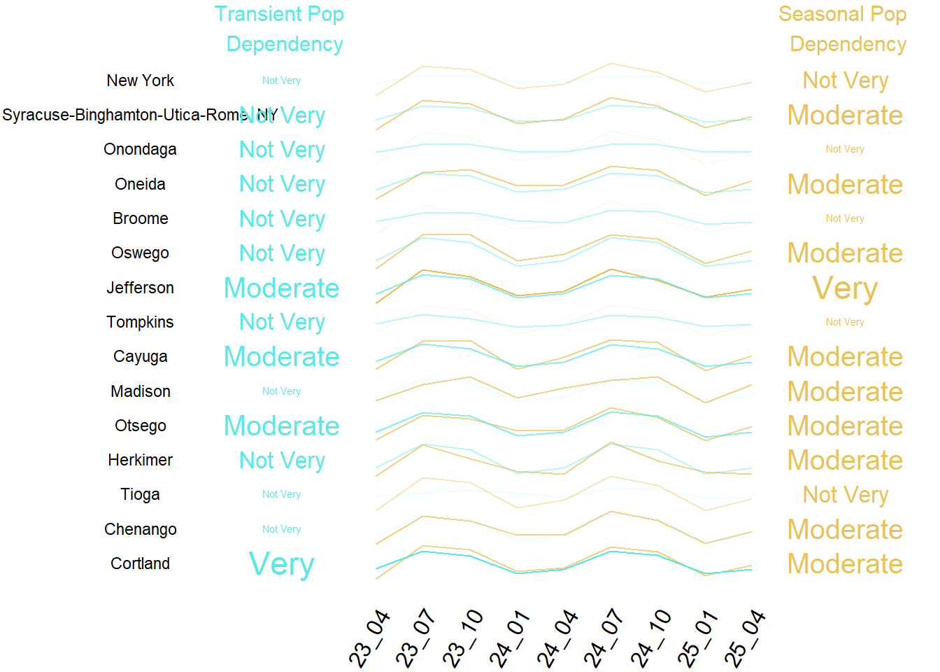 Transient visitation peaks in the Summer with a Transient Population of 33,569. The off season for transient visitation is the Winter with an avg over night stay count of 11,588. Given the difference between the primary and off seasons the Syracuse-Binghamton-Utica-Rome, NY Market is classified as having a Extreme level of transient seasonal variation, ranking 27th across STI Markets.
