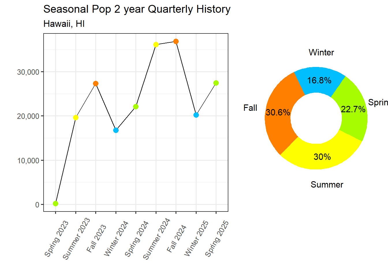 Seasonal visitation peaks in the Fall with a Seasonal Population of 36,890. The off season is the Winter with a Seasonal Population of 20,225. Given the difference between the primary and off seasons the Hawaii, HI Market is classified as having a Low level of seasonal variation, ranking 163rd across STI Markets.