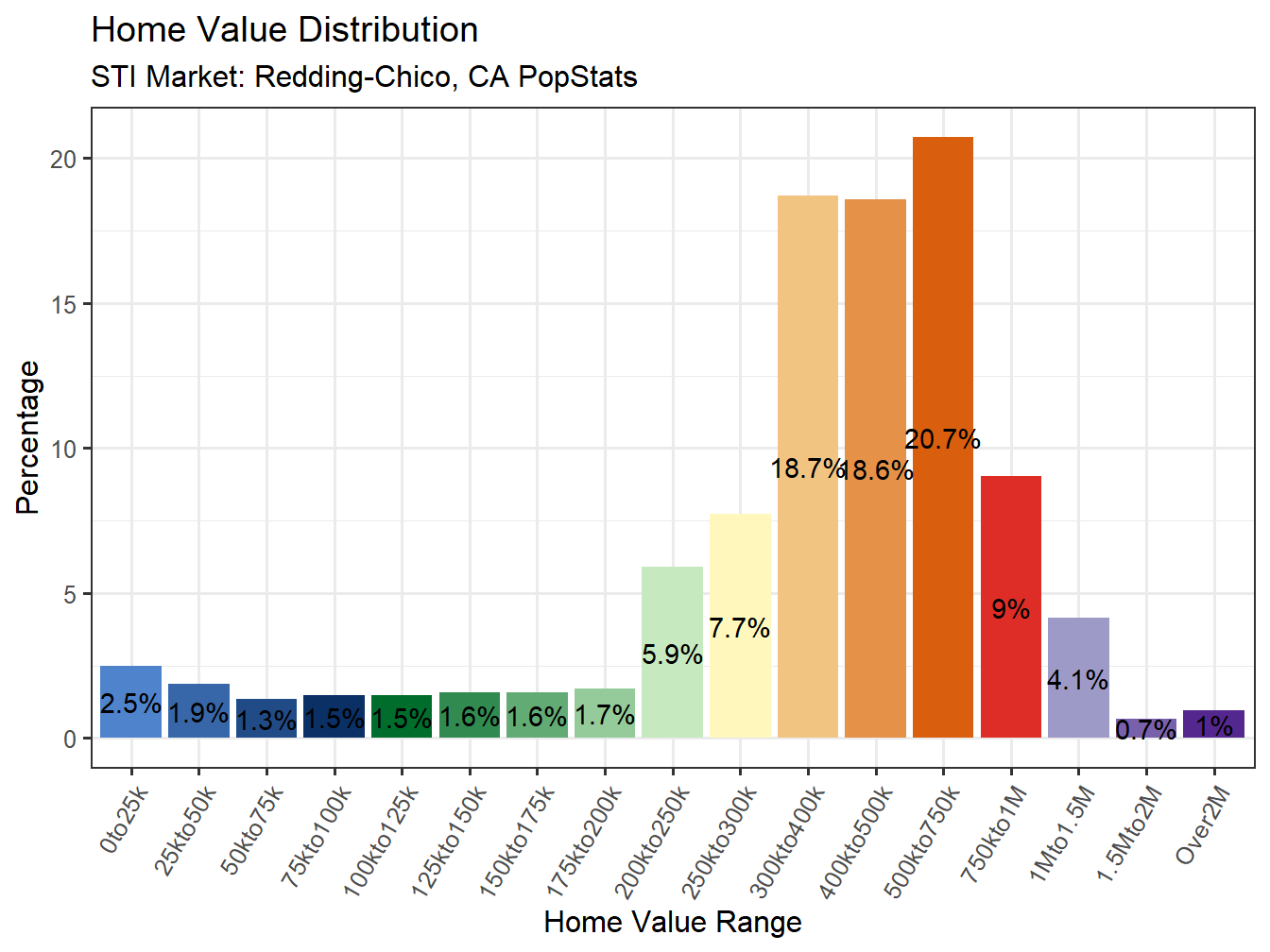 The Average Home Value for owner occupied housing units in the Redding-Chico, CA Market is $487,452. This ranks 46th across STI Markets. Over the last 2 years there has been a change of 7.3% in this markets Average Home Value, compared to a national change of 11.8%. This 2 year change in home values ranks 144th across STI Markets.