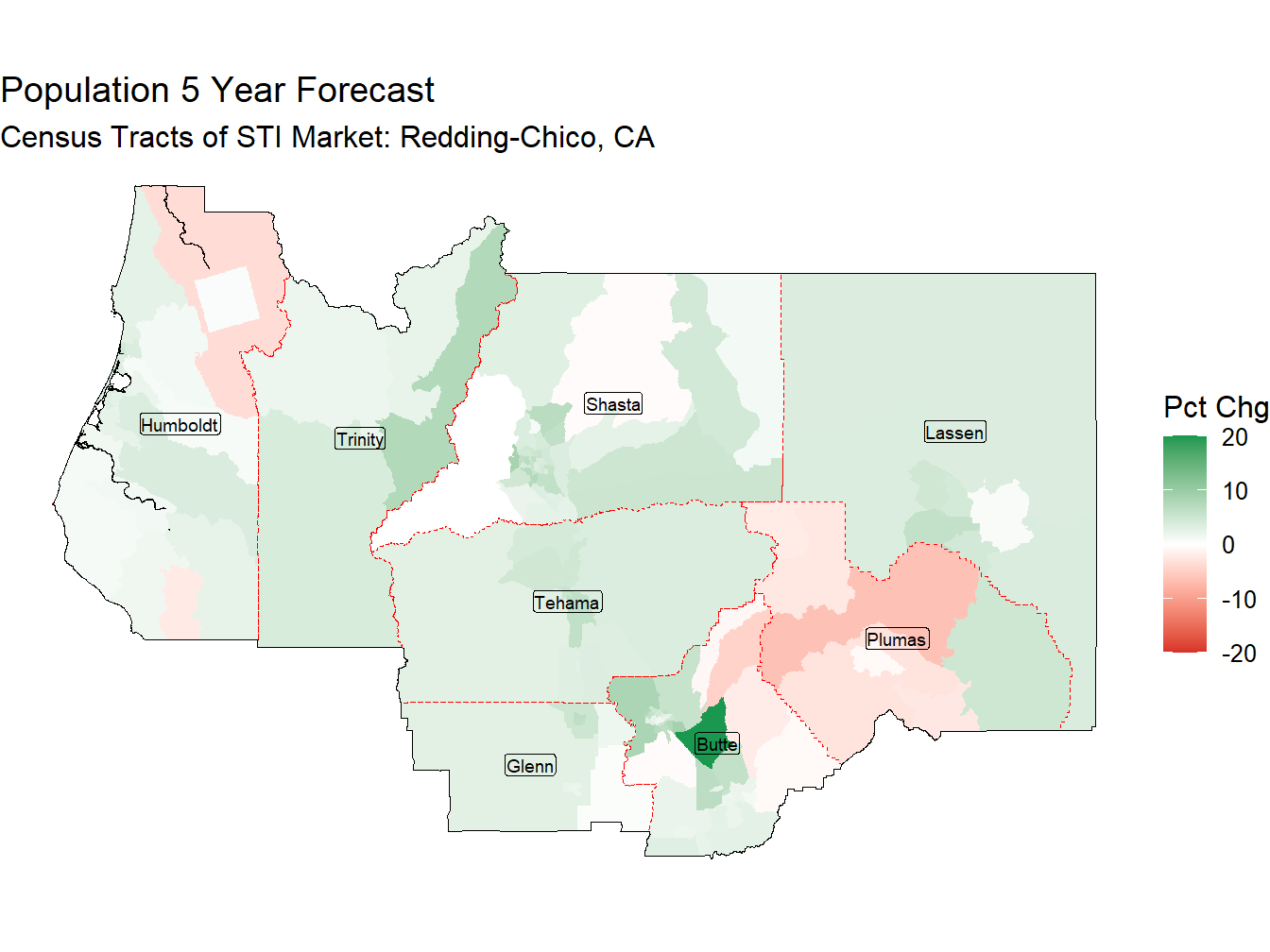 While the summation of mid range 5 year forecasts foresee a change in Population of 4.2% for Redding-Chico, CA Market. The forecast high ranges of these forecasts leaves open the possibility for a Population change as high as 8% at 735,636. Similarly a population change as low as -2.2% at 665,852 is not without possibility.