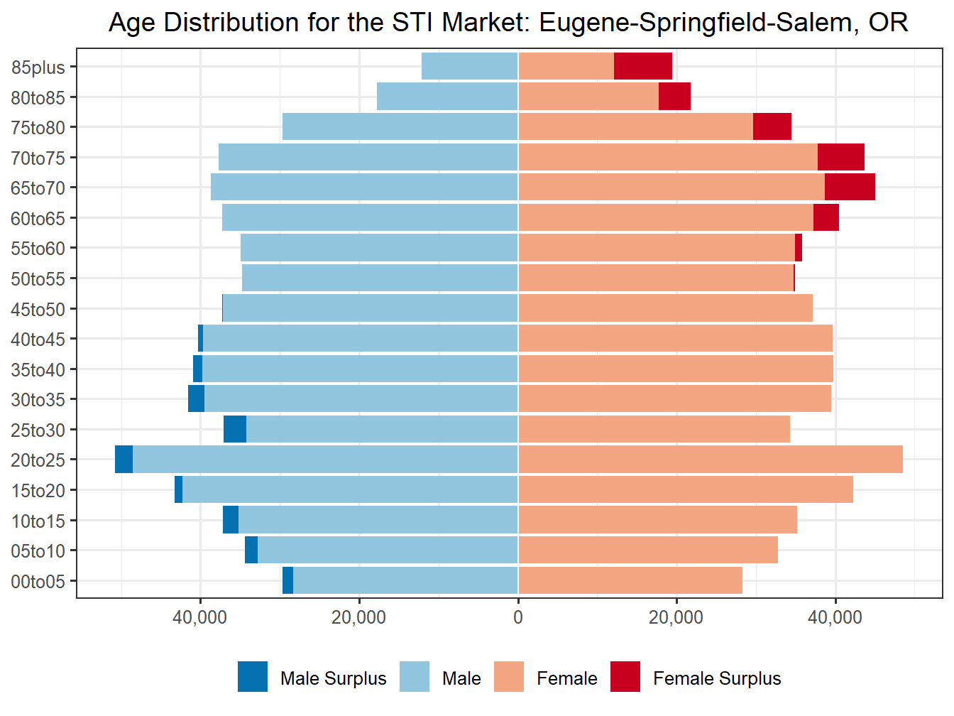 The Eugene-Springfield-Salem, OR market has a dependency ratio of 63 which is considered a High level of dependency. The proportion of that dependent population that is under 15 is 40% and subsequently this market could be age wise considered Elderly. These two classifications in mind the Eugene-Springfield-Salem, OR market falls in the Aged Age Structure Classification.