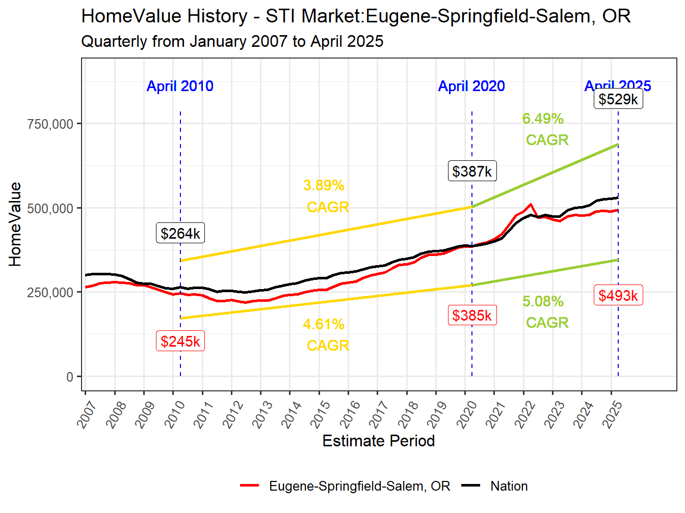 The Average Home Value for owner occupied housing units in the Eugene-Springfield-Salem, OR Market is $493,069. This ranks 42nd across STI Markets. Over the last 2 years there has been a change of 7% in this markets Average Home Value, compared to a national change of 11.8%. This 2 year change in home values ranks 146th across STI Markets.