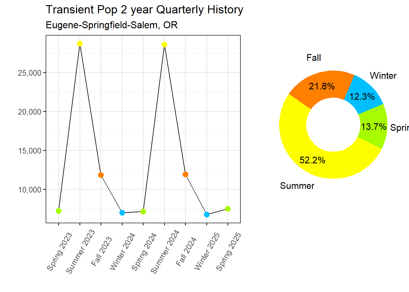 Transient visitation peaks in the Summer with a Transient Population of 28,605. The off season for transient visitation is the Winter with an avg over night stay count of 6,761. Given the difference between the primary and off seasons the Eugene-Springfield-Salem, OR Market is classified as having a Extreme level of transient seasonal variation, ranking 9th across STI Markets.
