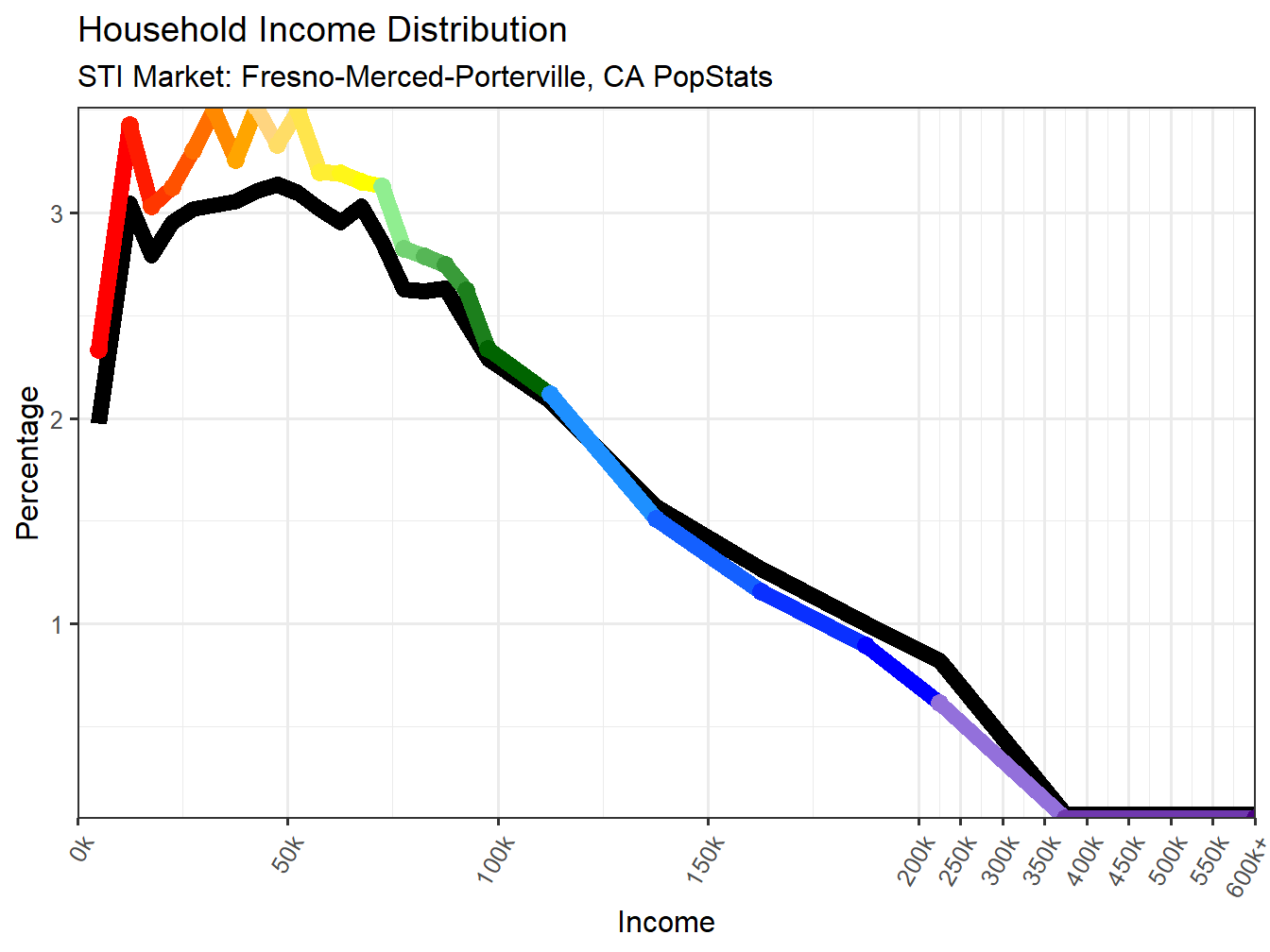 Below the multi-colored line represents the same data for household income in the Fresno-Merced-Porterville, CA market, but more equally lays out the distribution of population versus the income level, correcting for differences in size of income ranges. You will also notice that after 200k the income ranges are scaled down so the focus is more centered on the more numerous Households making under 200k. The black line represents the National Income Distribution for comparison.
