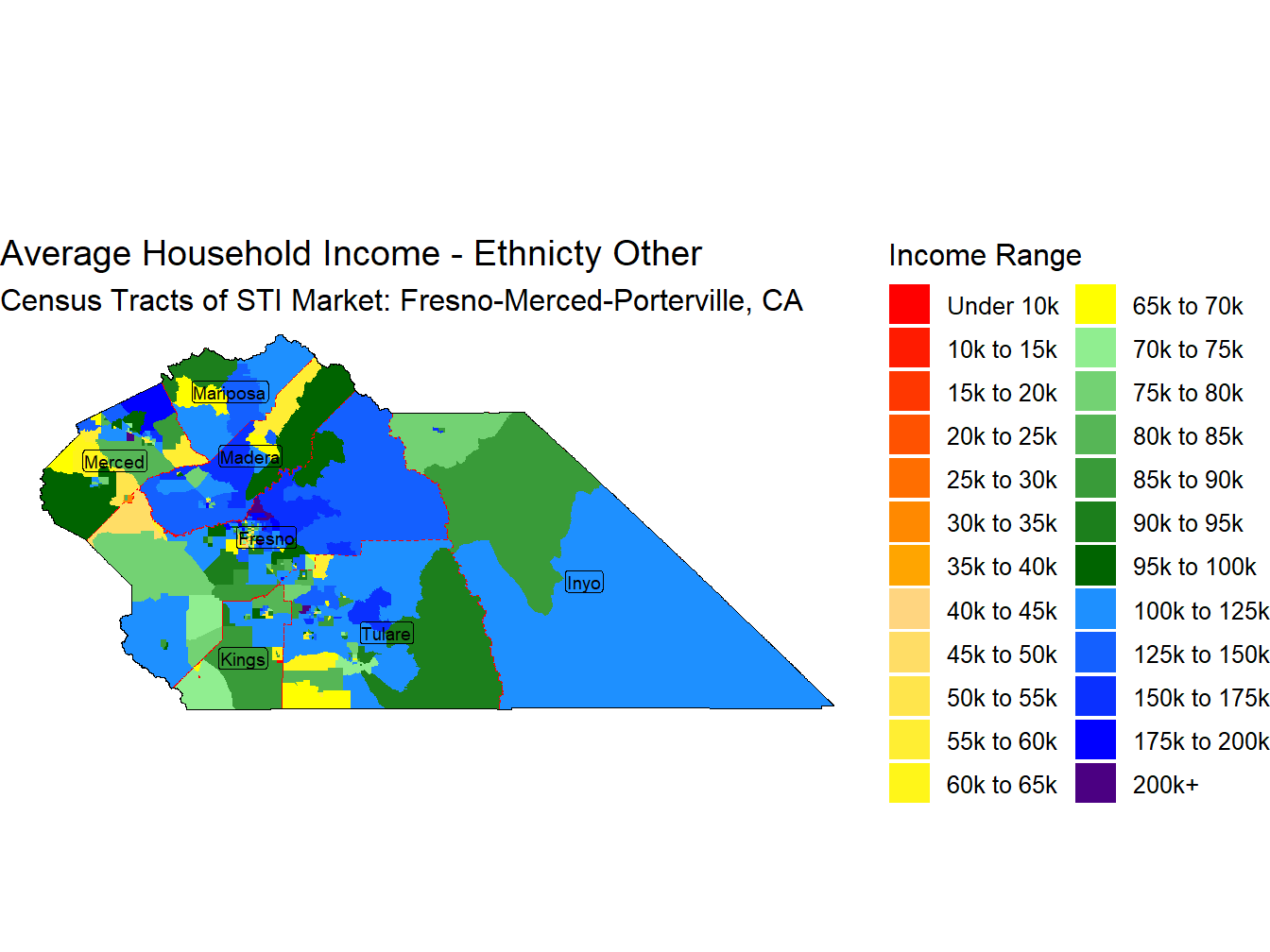 With an Average Household Income for those head of householders Non-Hispanic White of $119,376 the Fresno-Merced-Porterville, CA market ranks 49th across STI Markets.
