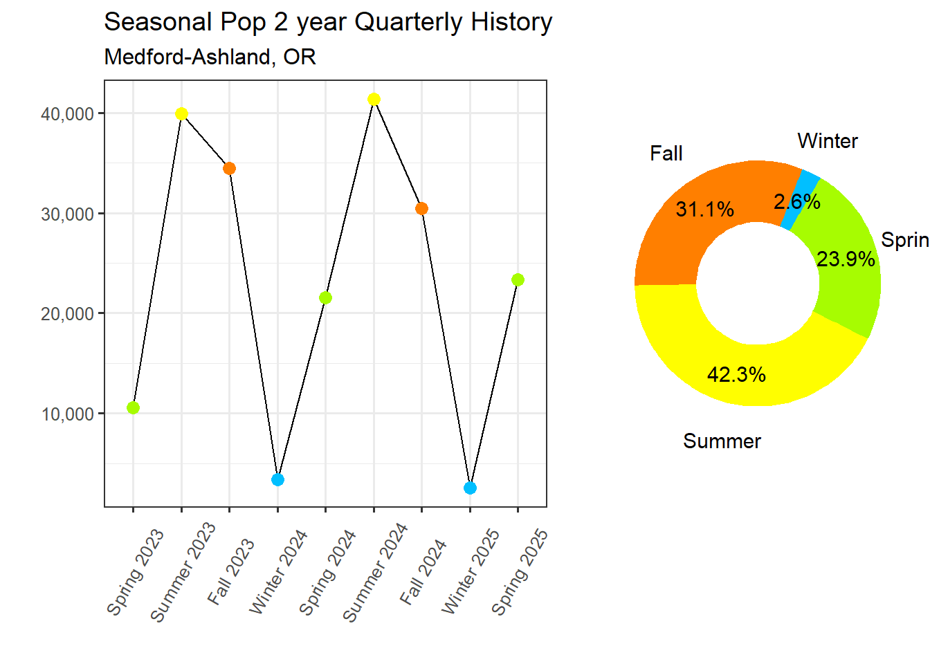 Seasonal visitation peaks in the Summer with a Seasonal Population of 41,394. The off season is the Winter with a Seasonal Population of 2,586. Given the difference between the primary and off seasons the Medford-Ashland, OR Market is classified as having a Extreme level of seasonal variation, ranking 29th across STI Markets.