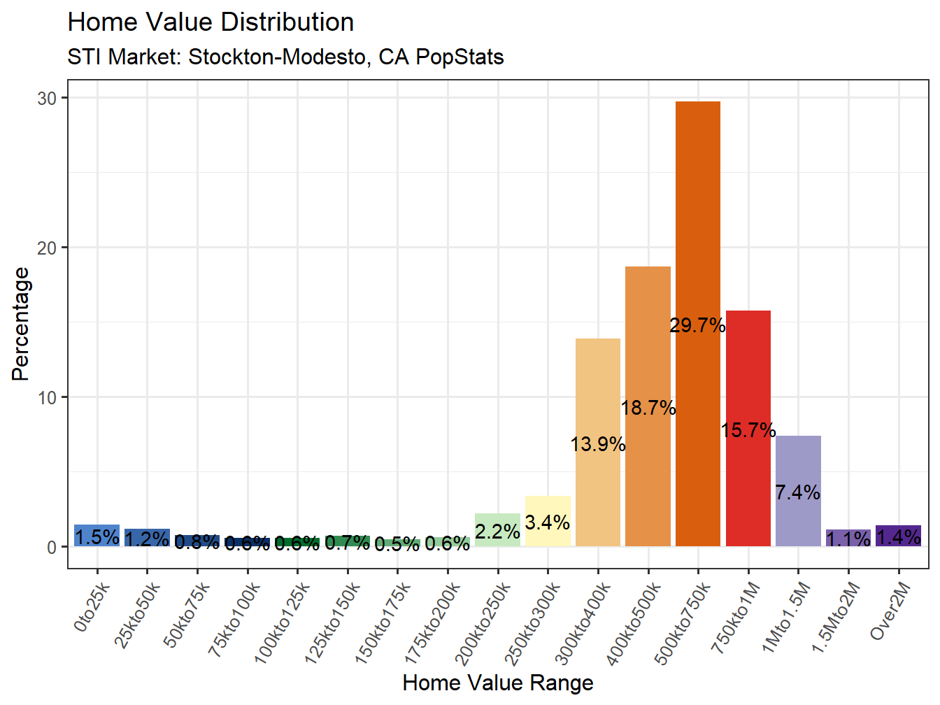 The Average Home Value for owner occupied housing units in the Stockton-Modesto, CA Market is $610,464. This ranks 20th across STI Markets. Over the last 2 years there has been a change of 8.8% in this markets Average Home Value, compared to a national change of 11.8%. This 2 year change in home values ranks 123rd across STI Markets.