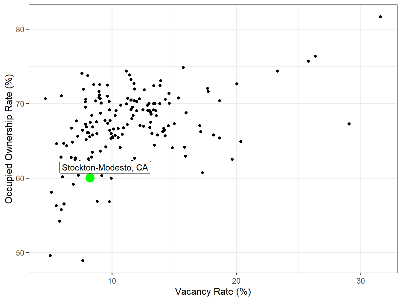 The Stockton-Modesto, CA Market ranks 125th in Vacancy across STI Markets with a Vacancy rate of 8.2%. That is 43,038 Vacant Housing units compared to 480,321 Occupied units.
