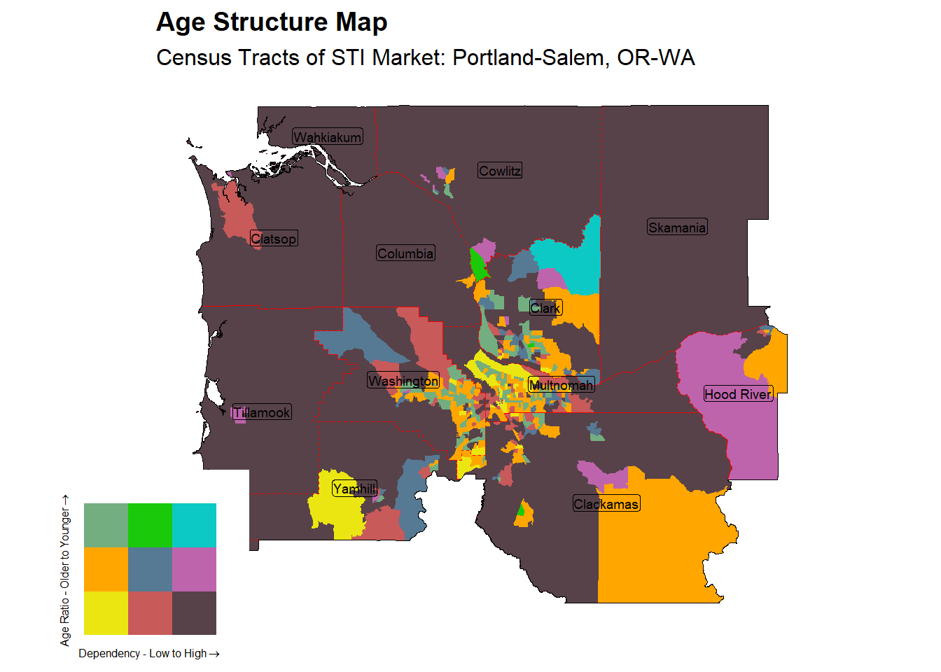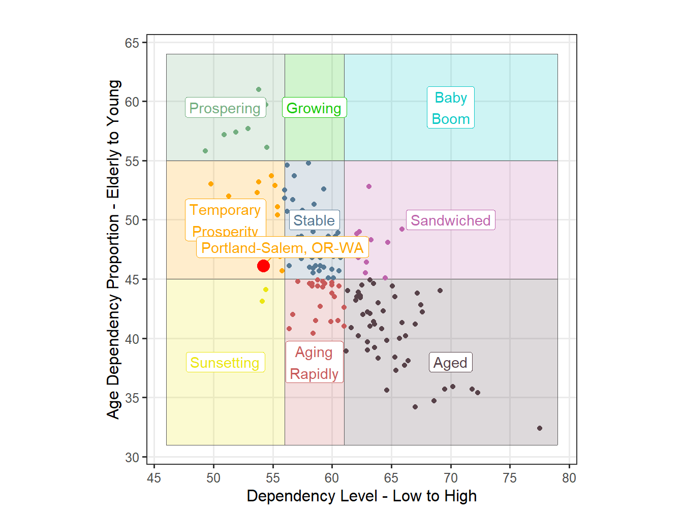 The Portland-Salem, OR-WA market has a dependency ratio of 54.2 which is considered a Low level of dependency. The proportion of that dependent population that is under 15 is 46% and subsequently this market could be age wise considered Balanced. These two classifications in mind the Portland-Salem, OR-WA market falls in the Temporary Prosperity Age Structure Classification.