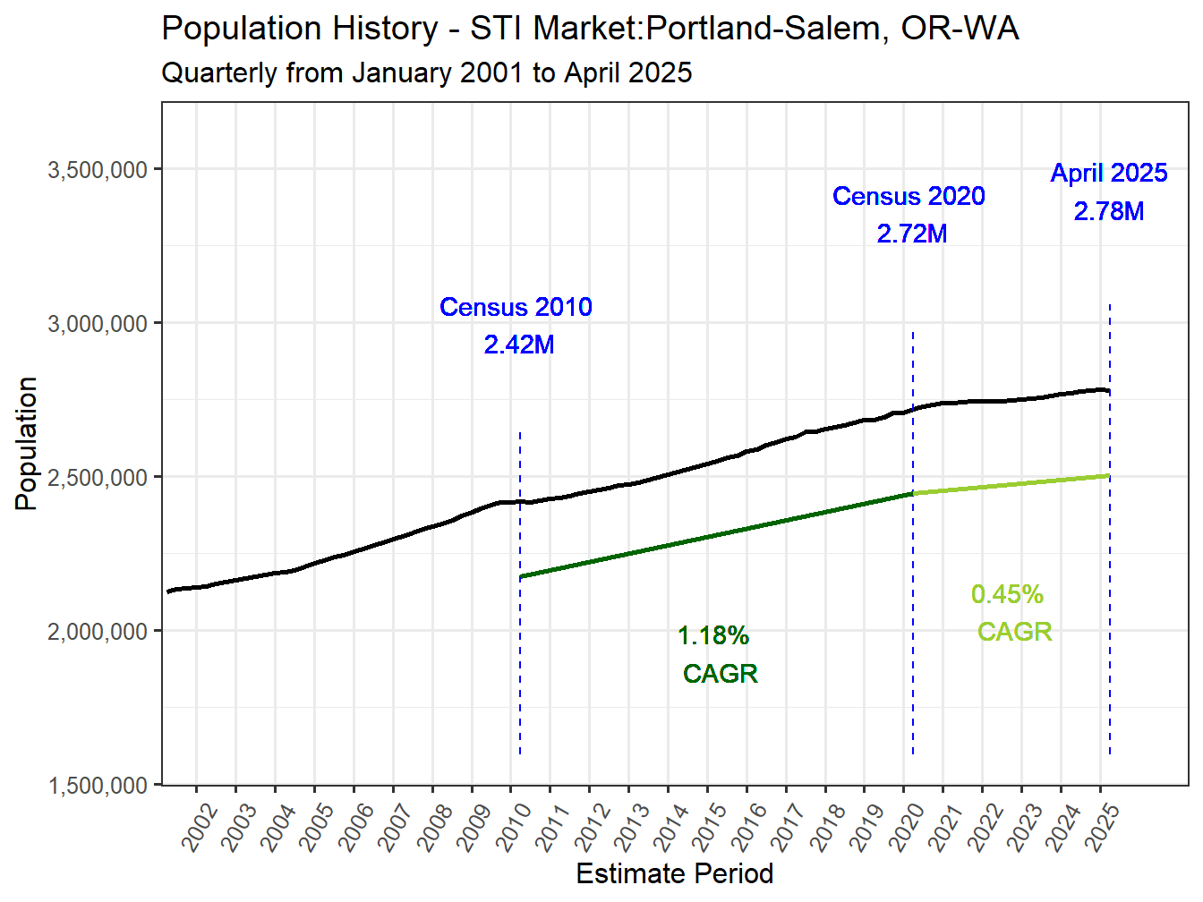 With a 2 Year Compound Annual Growth Rate (CAGR) of 0.51% the Portland-Salem, OR-WA Market is growing. It ranks 71st in 2 year population change across all STI Markets.