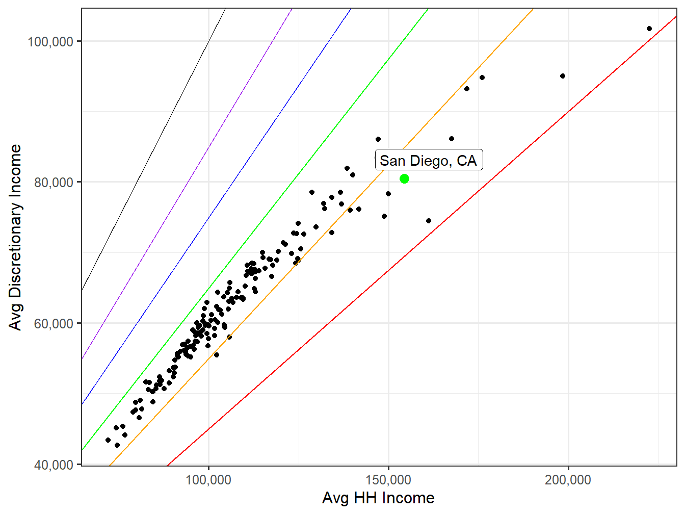 Discretionary income goes a step further. It takes Disposable Income, which already accounts for taxes, and accounts for the typical cost of Food, Housing, and Clothing. The Average Household Discretionary Income is $80,478 which ranks 11th across STI Markets.