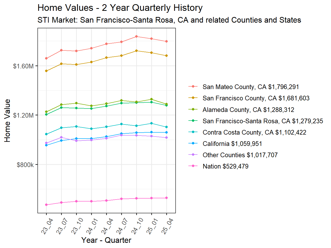 The Average Home Value for owner occupied housing units in the San Francisco-Santa Rosa, CA Market is $1,279,235. This ranks 3rd across STI Markets. Over the last 2 years there has been a change of 6.1% in this markets Average Home Value, compared to a national change of 11.8%. This 2 year change in home values ranks 153rd across STI Markets.