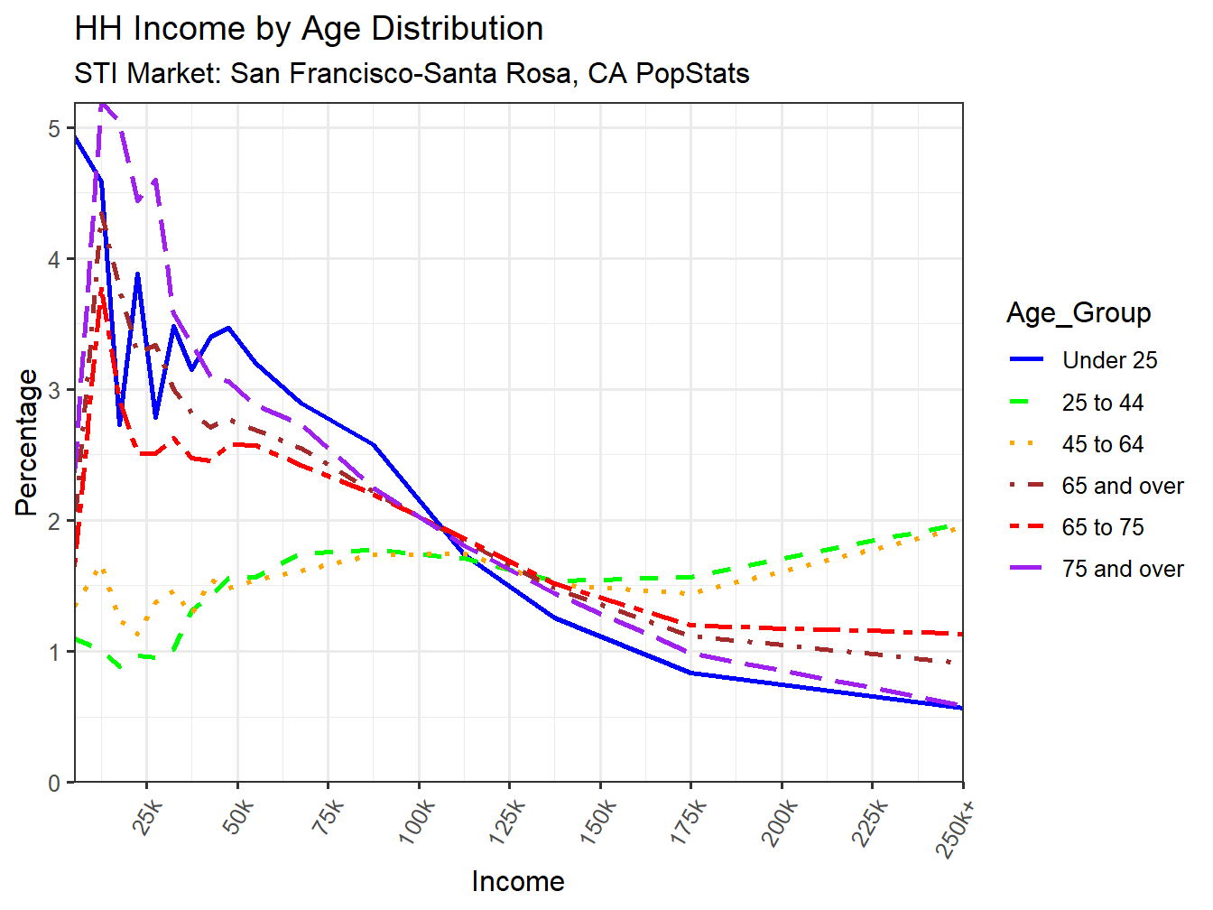 Below the multi-colored line represents the same data for household income in the San Francisco-Santa Rosa, CA market, but more equally lays out the distribution of population versus the income level, correcting for differences in size of income ranges. You will also notice that after 200k the income ranges are scaled down so the focus is more centered on the more numerous Households making under 200k. The black line represents the National Income Distribution for comparison.