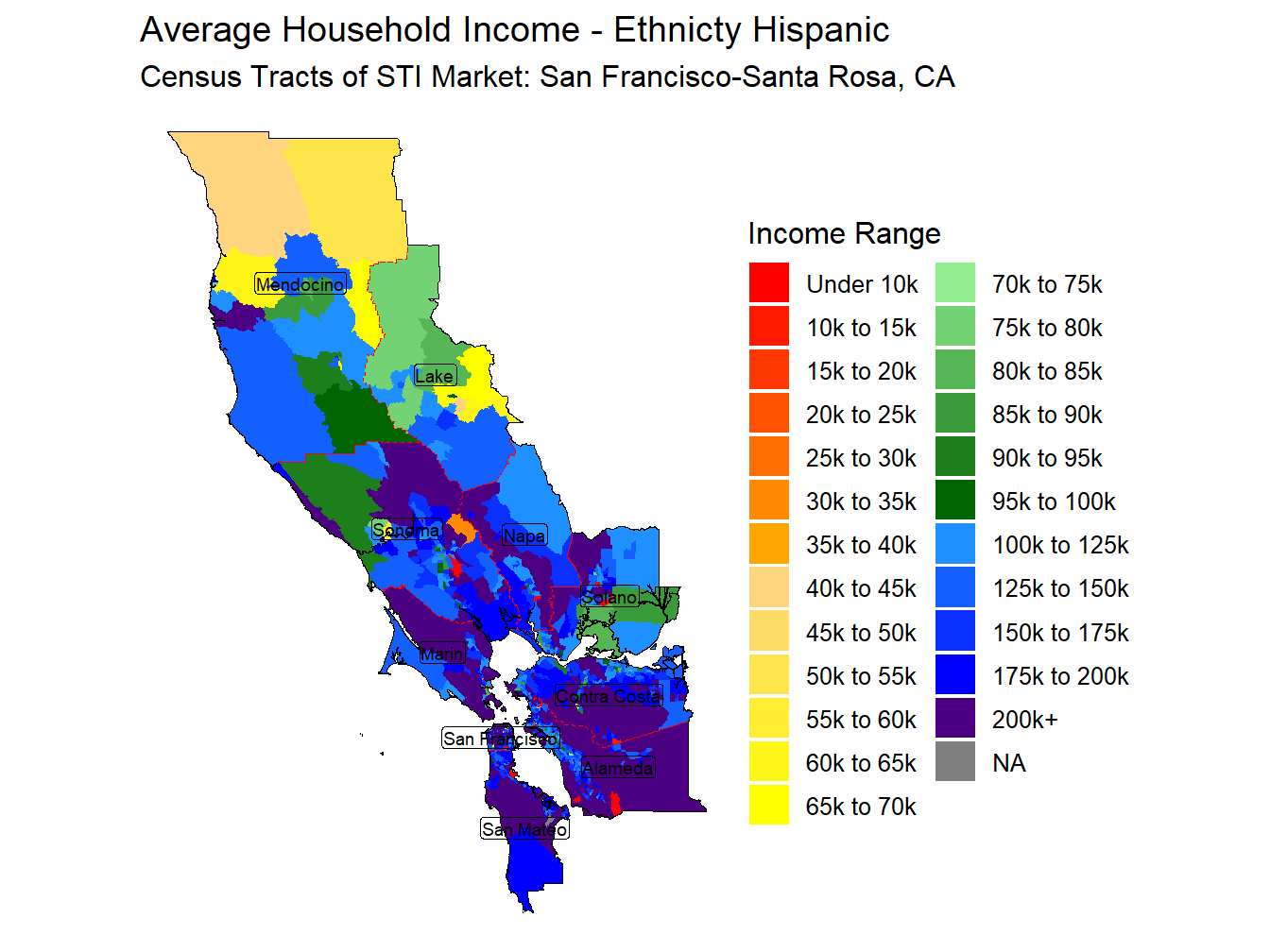 With an Average Household Income for those head of householders Non-Hispanic White of $208,428 the San Francisco-Santa Rosa, CA market ranks 2nd across STI Markets.