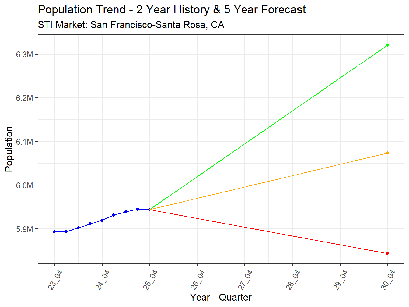 The current population of the San Francisco-Santa Rosa, CA Market is 5,943,611 as of the April 2025 PopStats estimate. PopStat’s Trend models indicate a 5 year population change of 2.2%, resulting in a Population of 6,073,802 by April 2030. This percentage change in Population ranks 93rd across STI Markets. The San Francisco-Santa Rosa, CA Market currently ranks 12th in overall population, and will rank 11th by April 2030.