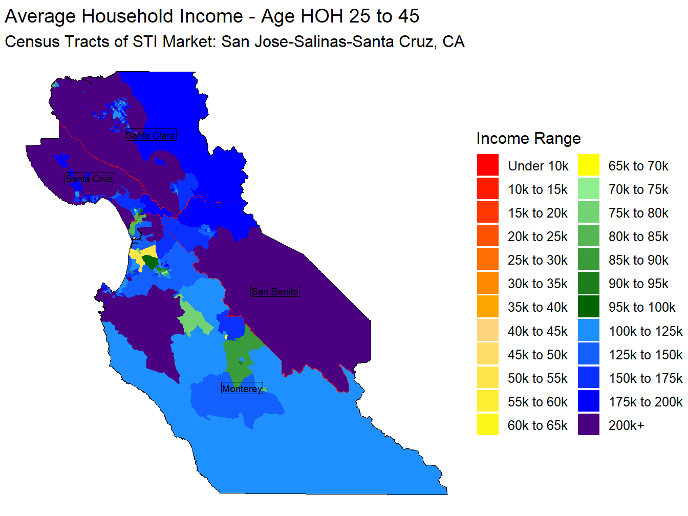 With an Average Household Income for those head of householders aged 25 to 45 of $245,366 the San Jose-Salinas-Santa Cruz, CA market ranks 1st across STI Markets.