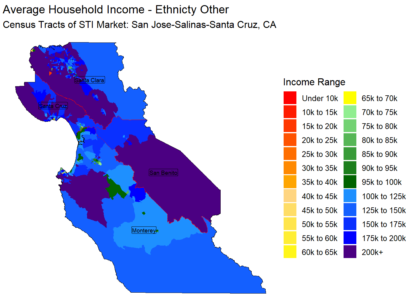 With an Average Household Income for those head of householders Non-Hispanic White of $226,416 the San Jose-Salinas-Santa Cruz, CA market ranks 1st across STI Markets.