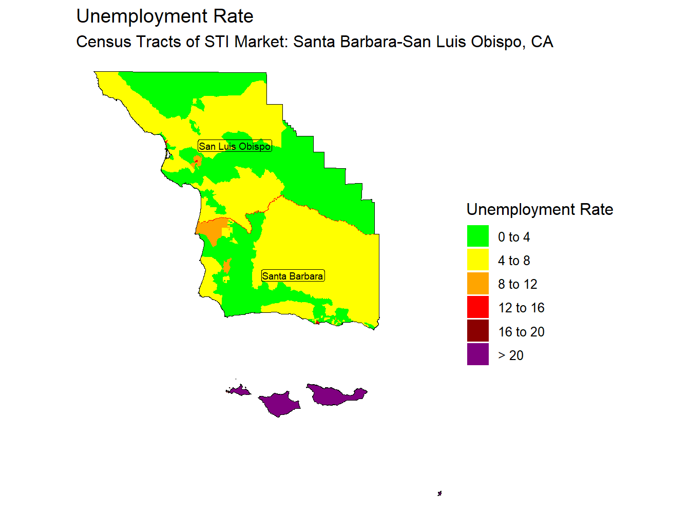 With an Unemployment Rate of 4.7% the Santa Barbara-San Luis Obispo, CA currently ranks 36th in Unemployment among the 167 STI Markets.