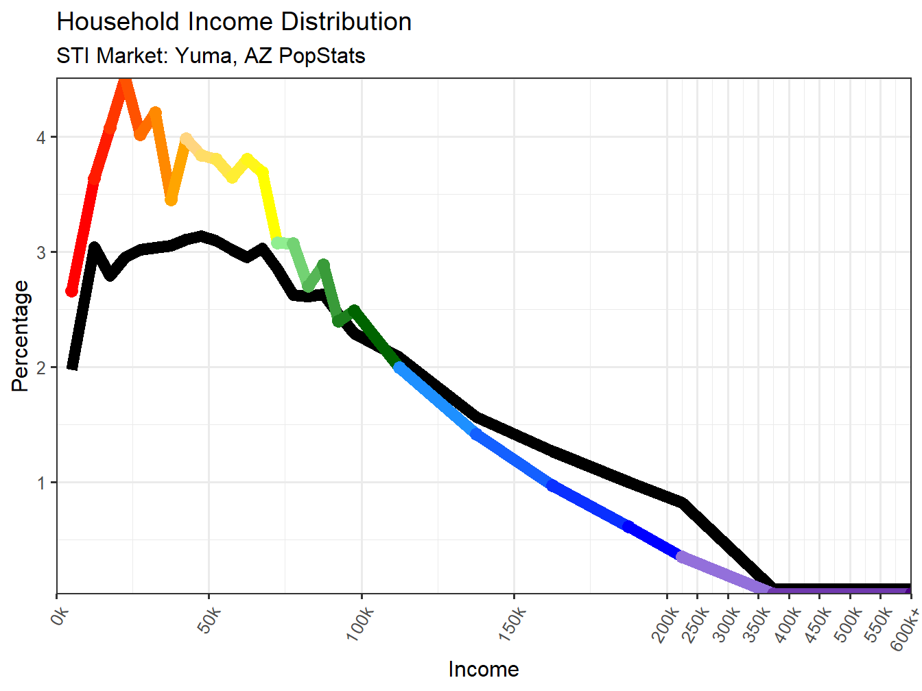 Below the multi-colored line represents the same data for household income in the Yuma, AZ market, but more equally lays out the distribution of population versus the income level, correcting for differences in size of income ranges. You will also notice that after 200k the income ranges are scaled down so the focus is more centered on the more numerous Households making under 200k. The black line represents the National Income Distribution for comparison.