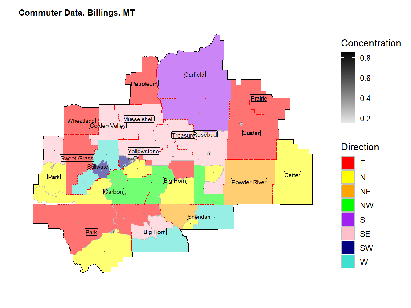 The following shows the commute to work patterns for the Billings, MT Market. The average direction is found via a circular mean function. The concentration is the proportion of overall travel headed in that direction and those adjacent to that direction. Length of arrow is scaled by the distance traveled. Together this allows for a general view of how traffic flows around the market each morning.