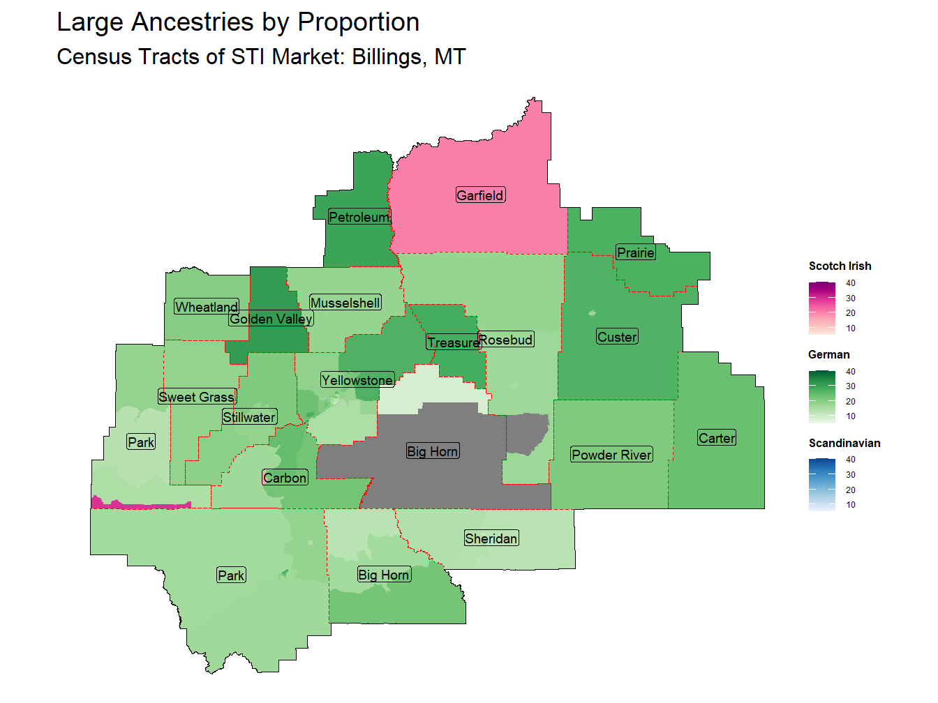 The Billings, MT Market is also home to a larger than average share of people with Native American, Dutch, and Spanish Ancestries. These ancestries account for 5.5%, 0.9%, and 0.5% of the population, respectively. With location quotient of 9.17, 1.8, and 1.67 the Native American, Dutch, and Spanish Ancestries rank 8th, 22nd, and 23rd across STI Markets, respectively.