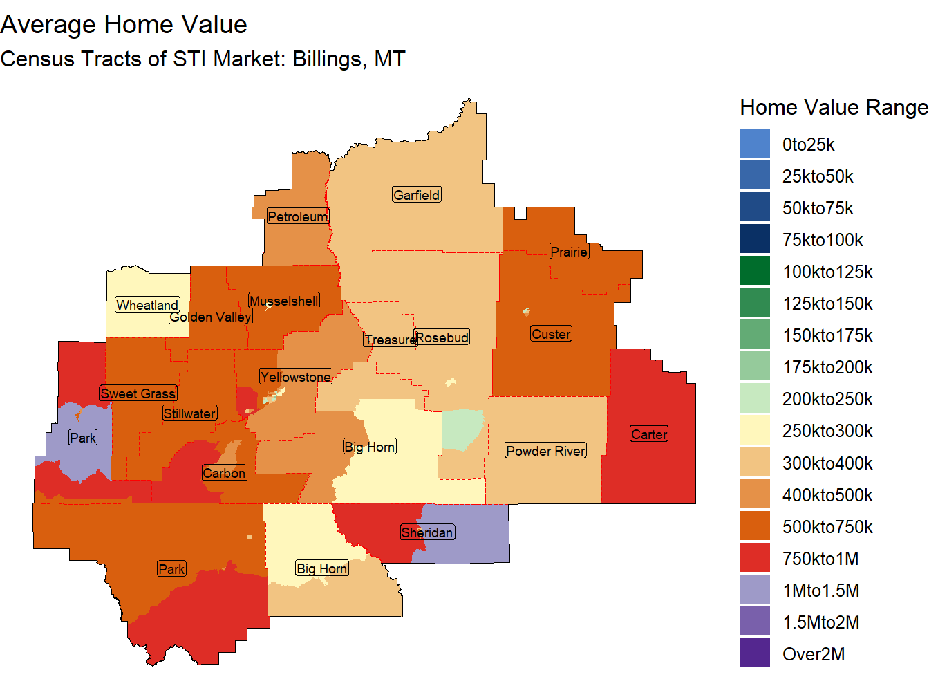 The Average Home Value for owner occupied housing units in the Billings, MT Market is $489,763. This ranks 43rd across STI Markets. Over the last 2 years there has been a change of 10.1% in this markets Average Home Value, compared to a national change of 11.8%. This 2 year change in home values ranks 109th across STI Markets.