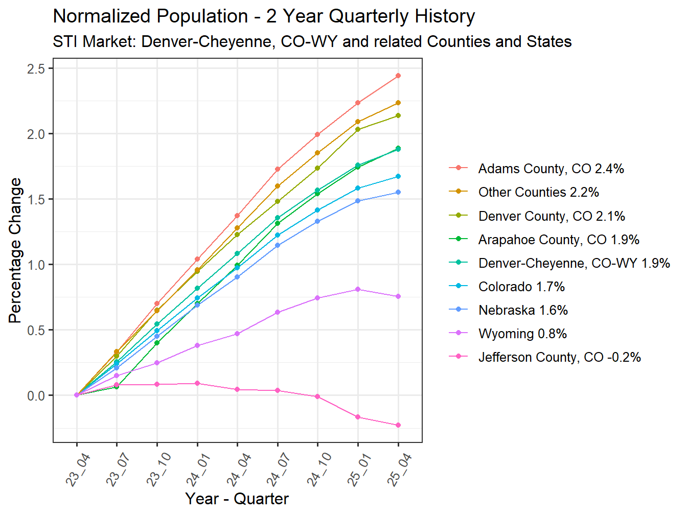 With a 2 Year Compound Annual Growth Rate (CAGR) of 0.93% the Denver-Cheyenne, CO-WY Market is growing. It ranks 42nd in 2 year population change across all STI Markets.